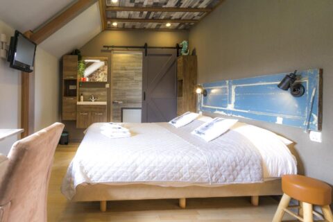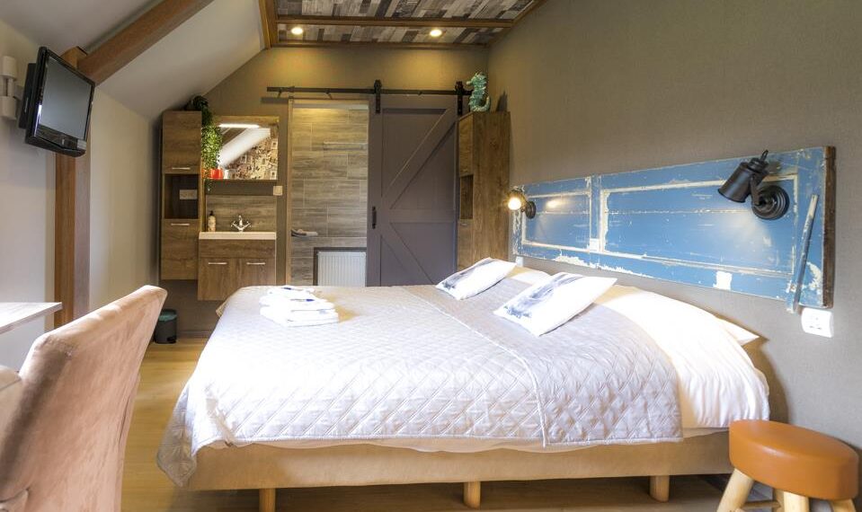 Deze kamer bevind zich op de begane grond en heeft een buitendeur naar het terras. Onze mooi verbouwde nieuwe kamers zijn voorzien van 2 één-persoons boxspringbedden, een eigen douche en toilet, zitje , smart tv, en een waterkoker